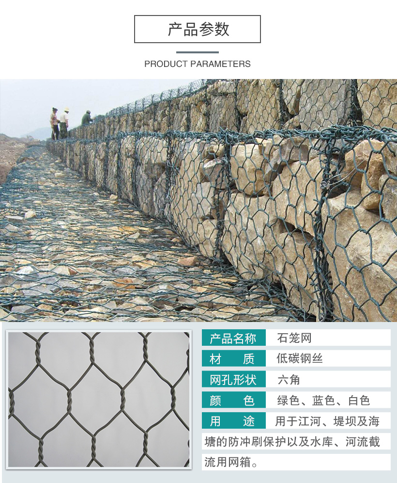 铅丝石笼网是由金属线材编织成角形网(六角网)组装而成的网箱,由于编织的金属线材类似铅丝,因此叫铅丝石笼网。根据工程设计要求组装成箱笼,并装入块石等填充料后连接成一体,用做堤防、路基防护、护坡护岸等工程。
